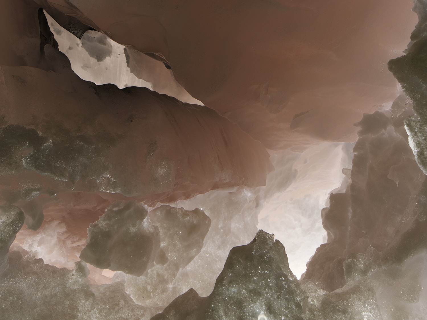 The video installation offers a careful and intimate observation of this ice giant, combining close-ups of ice and snow with their gradual transformation into increasingly large streams of water. It is an experimental animated documentary film based on photographs taken during a residency on the glacier in 2018. Animation was chosen both to make the acceleration of the melting process—which is extremely rapid in the Alps—more tangible and to minimize the amount of equipment that needed to be transported up the mountain. It was also a way of merging two mediums: photography and video.